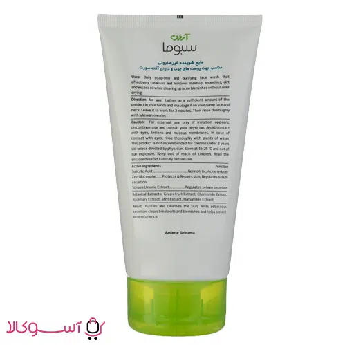 این شوینده غیر صابونی با دارا بودن سبونورمین و عصاره های رزماری و گریپ فروت نقش مهمی در تنظیم و متعادل سازی چربی پوست دارد. در شوینده غیر صابونی سبوما آردن از سورفکتانت های ملایم استفاده شده که بسیار ملایم هر گونه آلودگی و گرد و غبار را از سطح پوست پاک می نمایند.