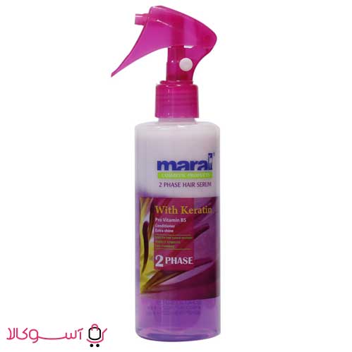 سرم دو فاز کراتینه مارال مدل conditioner یک ماسک خاص برای ساقه های مو است. این سرم حاوی ترکیبات متنوعی نظیر پروتئین ابریشم، کراتین، سرامید، عصاره آلوئه ورا، سیلیکون و… می باشد. این ترکیبات با ویژگی های خاصی که دارند زیبایی موها را به ارمغان می آورند. از جمله ترکیبات ویژه و خاص موجود در این سرم ، پروتئین ابریشم است که حالت ابریشم مانند به ساقه های مو داده و احساس رضایت وصف ناپذیری برای ساق های مو به همراه دارد. کراتین موجود در سرم ، افزایش استحکام و مقاومت تارهای مو را در برابر عوامل آسیب رسان، موجب می شود. در کنار این ترکیبات، استفاده ی هوشمندانه ازآلوئه ورا و سرامید، نرمی و انعطاف پذیری موها را موجب شده که باعث رفع مشکلاتی نظیر خشکی، گره خوردگی و عدم حالت پذیری مو می شود. سلیکون موجود در سرم مو دو فاز، یک ساختار شبکه مانند بر روی ساقه های مو ایجاد کرده که باعث درخشندگی چشم نواز در موها می شود. سرم دو فاز کراتینه یک محصول ویژه برای افزایش درخشندگی، نرمی، شانه پذیری و حالت پذیری موها می باشد.